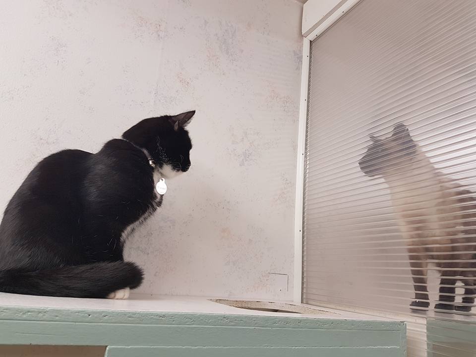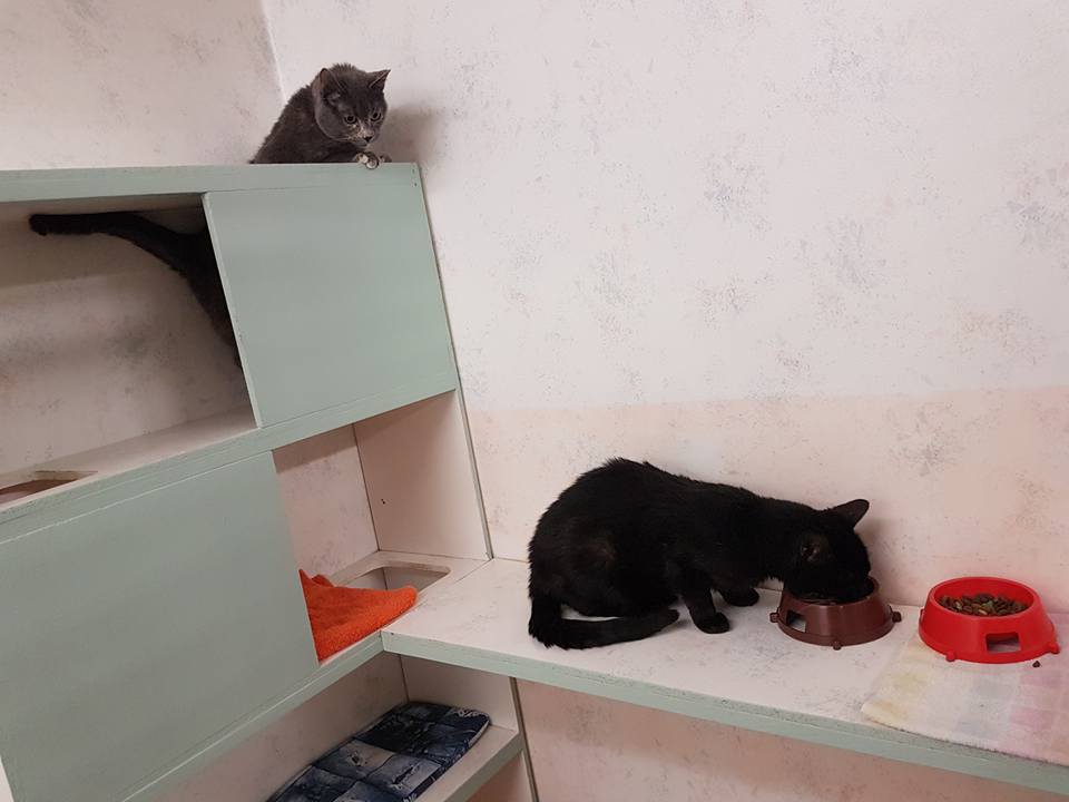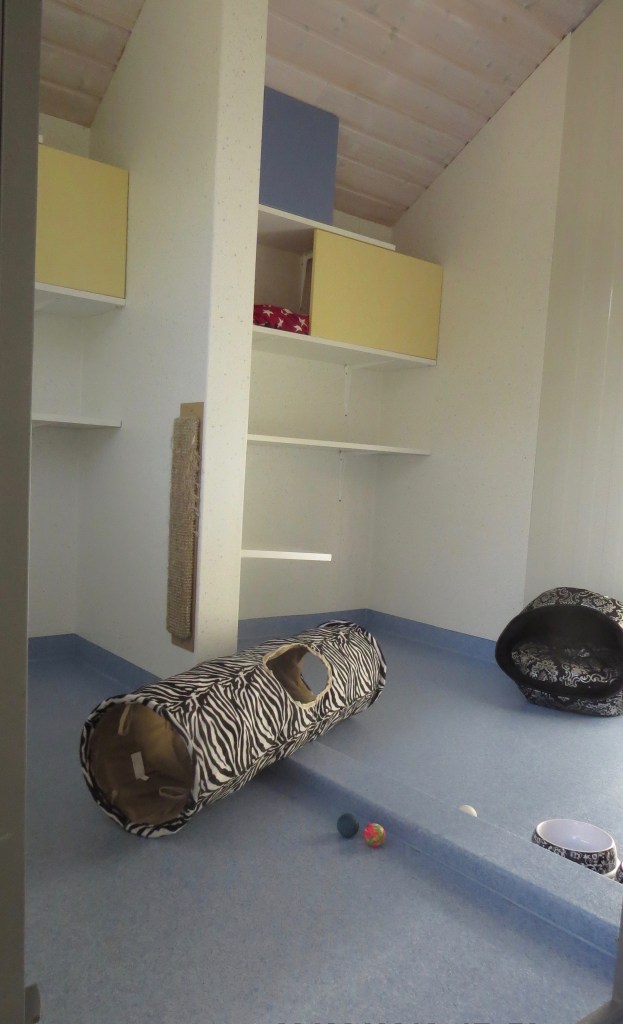 Vi har ingen verksamhet med hittekatter på grund av smittorisken. Alla våra gäster är vaccinerade. Hundarna och katterna bor helt separerade.